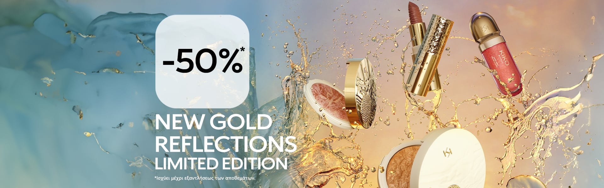 Ένα ηλιοβασίλεμα στη θάλασσα, μια παραλιακή Ιταλική πόλη που ξυπνά λουσμένη στο φως, ένας κρυμμένος θησαυρός που περιμένει να τον ανακαλύψετε, να τον ζήσετε, να τον φορέσετε: αυτή είναι η μαγεία της Gold Reflections, της νέας, πολύτιμης συλλογής της KIKO MILANO. Για ένα καλοκαίρι ατελείωτης ομορφιάς. *Κλινικές δοκιμές με όργανα πραγματοποιήθηκαν σε επιλεγμένες φόρμουλες και προϊόντα. Αδιάβροχα: Gold Reflections Summerproof Powder Foundation SPF 50, Gold Reflections 48h Wear Waterproof Eye Marker, Gold Reflections 12h Wear Waterproof Lip Liner Ενυδατικά: Gold Reflections Flawless Mirage Luminous Face Base, Gold Reflections 3D Hydra Lip gloss Limited Edition, Gold Reflections Hydra Gleam Lip Balm Διαρκείας: Gold Reflections 48h Wear Waterproof Eye Marker, Gold Reflections 12h Wear Waterproof Lip Liner, Gold Reflections Volume & Care Effect Mascara, Gold Reflections 10h Wear Graphic Eyeliner & Kajal, Gold Reflections Sun Mirage Liquid Eyeshadow